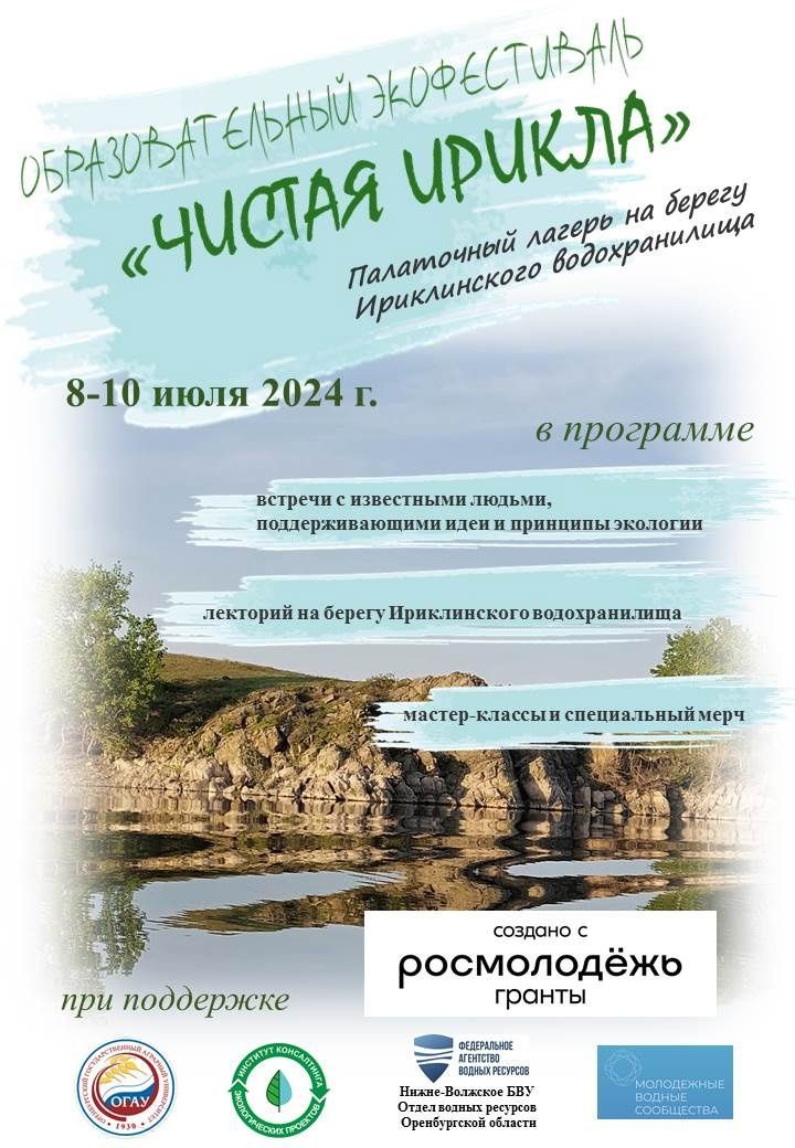 8-10 июля Молодежное водное сообщество Оренбургской области проведёт Образовательный экофестиваль «Чистая Ирикла» в сотрудничестве с командой отдела по Молодежной политике Оренбургского государственного аграрного университета – партнера Института консалтинга экологических проектов.